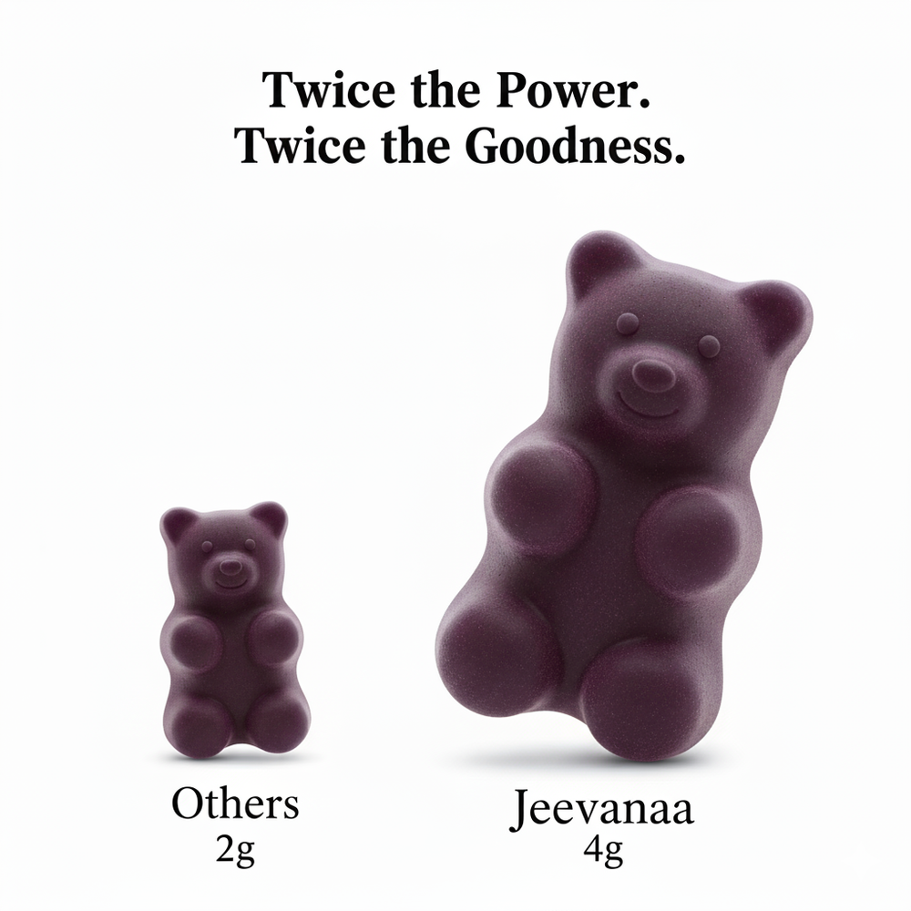 Standard 2g gummies leave little room for meaningful nutrition. Jeevanaa™ doubles the size to 4g — giving space for clinically researched ingredients like magnesium bisglycinate, L-theanine, and adaptogens. More actives per gummy means fewer servings, stronger results, and better value with every pouch.